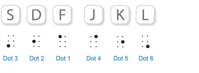 The left hand index finger will use letter 'f' for dot 1 of the braille cell, with 2nd and 3rd fingers of the left hand using letters 'd' and 's' for dots 2 and 3. The right hand index finger will use letter 'j' for dot 4, with 2nd and 3rd fingers of the right hand using letters 'k' and 'l' for dots 5 and 6